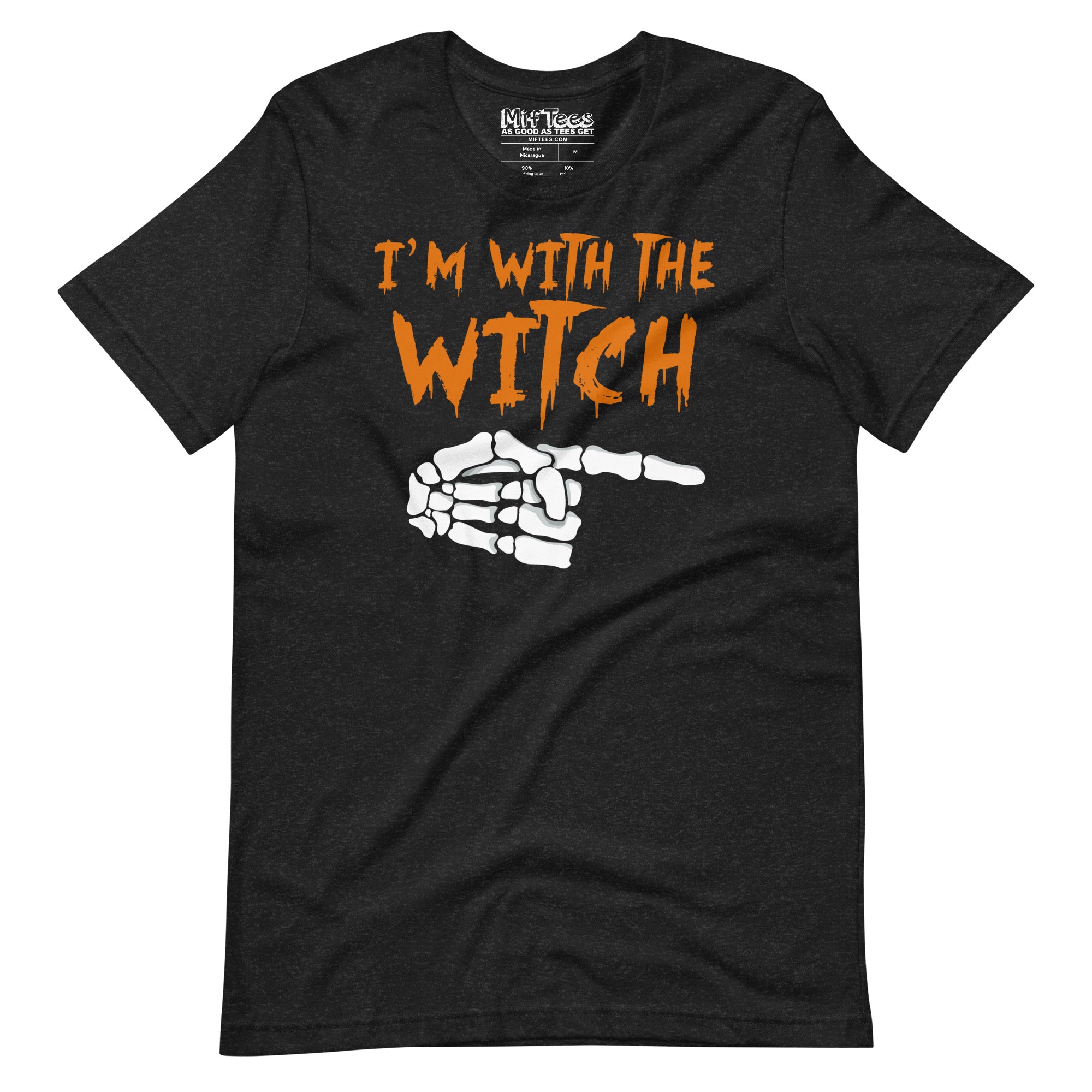 Let everyone know you’re rolling with the spell-caster in charge with this “I’m With the Witch” tee! Featuring a skeleton hand pointing right, it’s the ultimate way to flaunt your spooky crew. Match it with our “I’m With the Witch” tee (hand pointing left) for a hilarious duo, or pair it with the “I’m Not a Witch, I’m Your Wife” tee for even more laughs! Whether you’re creeping through a Halloween party, casting spells at a haunted house, or just hanging with your wickedly funny friends, this tee is a must-have for showing off your witchy connections.
