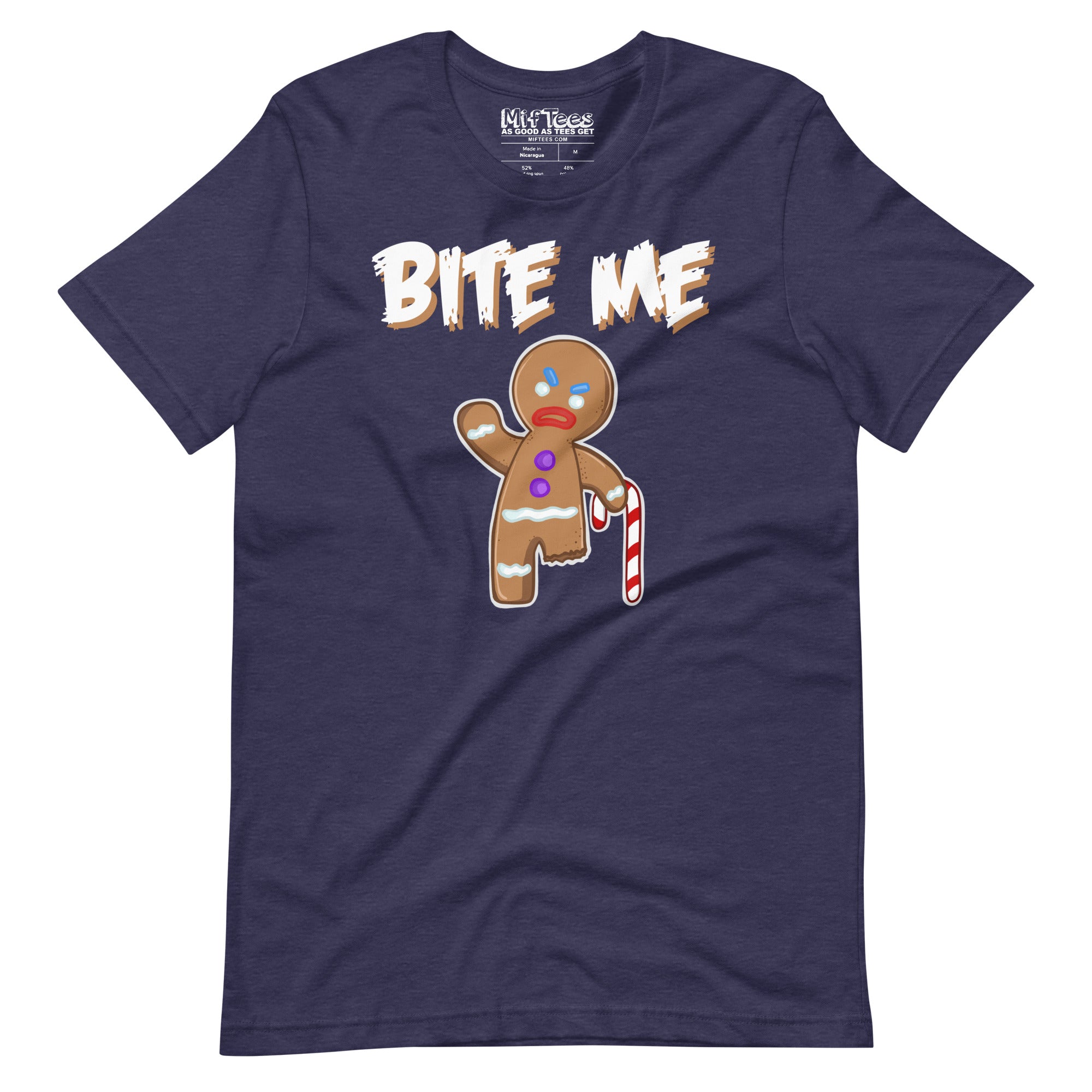 This Bite Me angry gingerbread man t-shirt is here to add some spice to your Christmas spirit! Featuring an irritated gingerbread man with a missing leg, rocking a candy cane crutch, and a serious attitude, this Christmas graphic tee is perfect for anyone who loves to serve up their holiday cheer with a side of sass. Tired of overly jolly holiday shirts? This gingerbread man is too, which is why he’s telling everyone to "Bite Me." Because let’s face it, the holidays can be a little... crumby sometimes!
