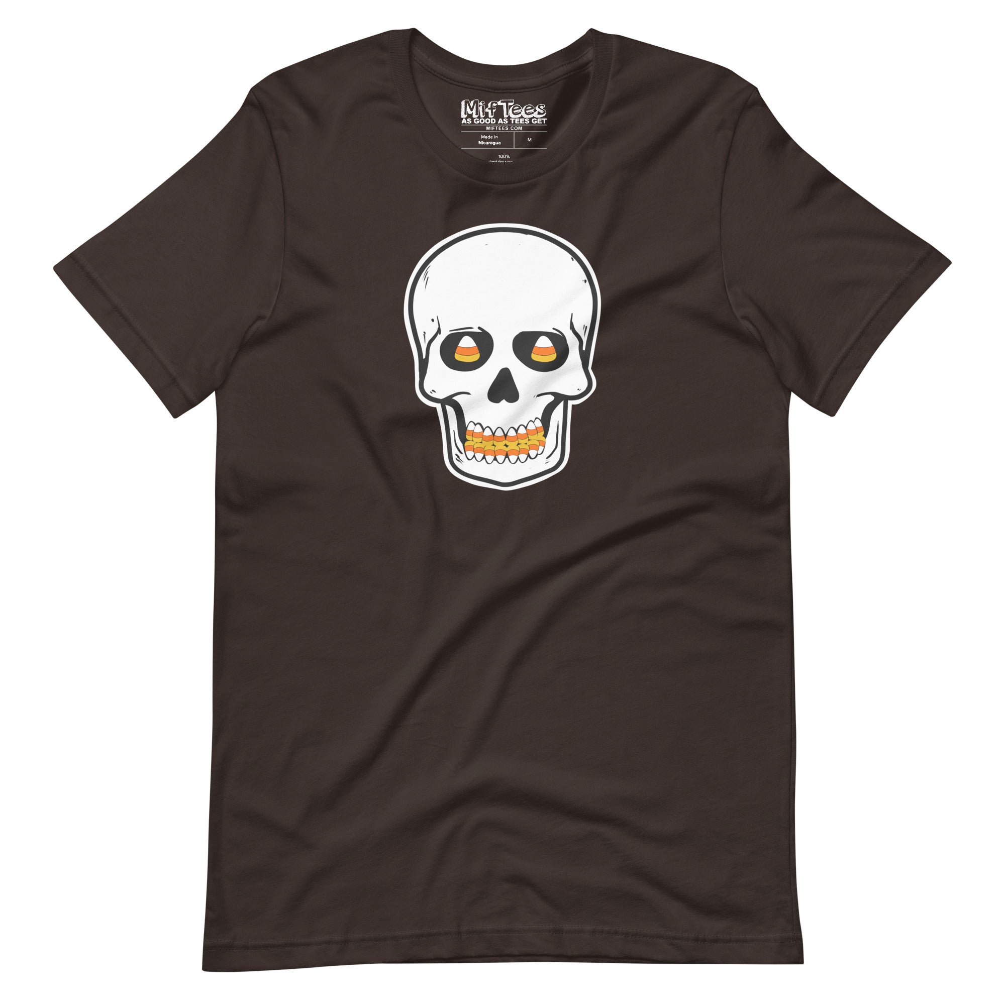 This novelty Candy Corn Skull tee features a skull with eyes and teeth made entirely out of candy corn! It’s the perfect blend of spooky and sweet, for those who love Halloween... and can’t resist those little candy corn triangles. Whether you’re a fan of candy corn or just like a good Halloween joke, this t-shirt is a fun way to show off your Halloween spirit—and your love for candy that’s shaped like teeth. Seriously, it’s a skull made of candy corn, how much better can it get?