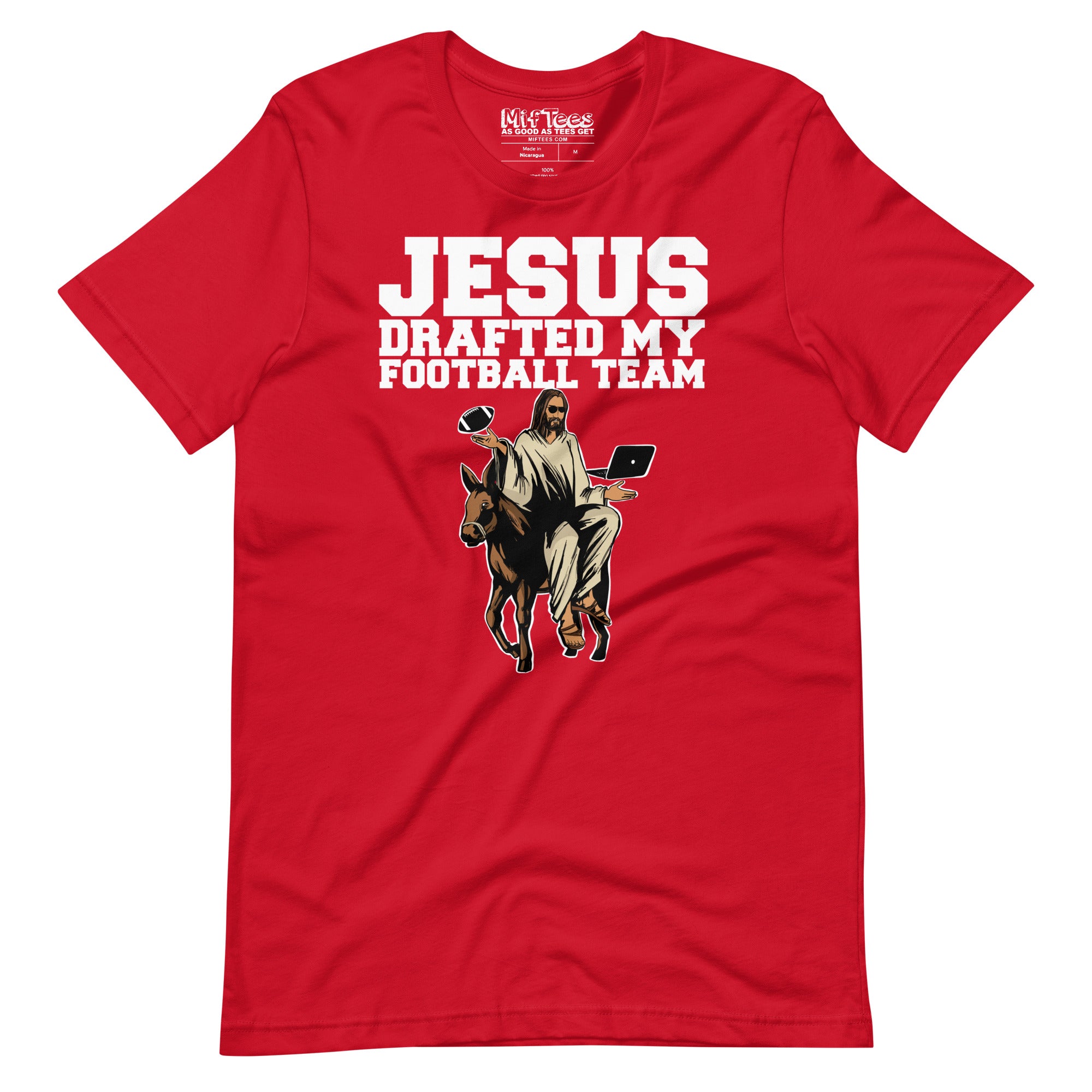 Kick off your fantasy football season with divine intervention! Our “Jesus Drafted My Football Team” tee is the perfect way to bring some heavenly help to your draft day. Featuring Jesus riding a donkey while holding a football and a laptop, this shirt makes sure your picks are both blessed and the talk of the town. Whether you're at the draft party or catching the sermon, this tee reminds everyone that even Jesus approves of your game plan. Make your team holier than thou with a touch of divine guidance!