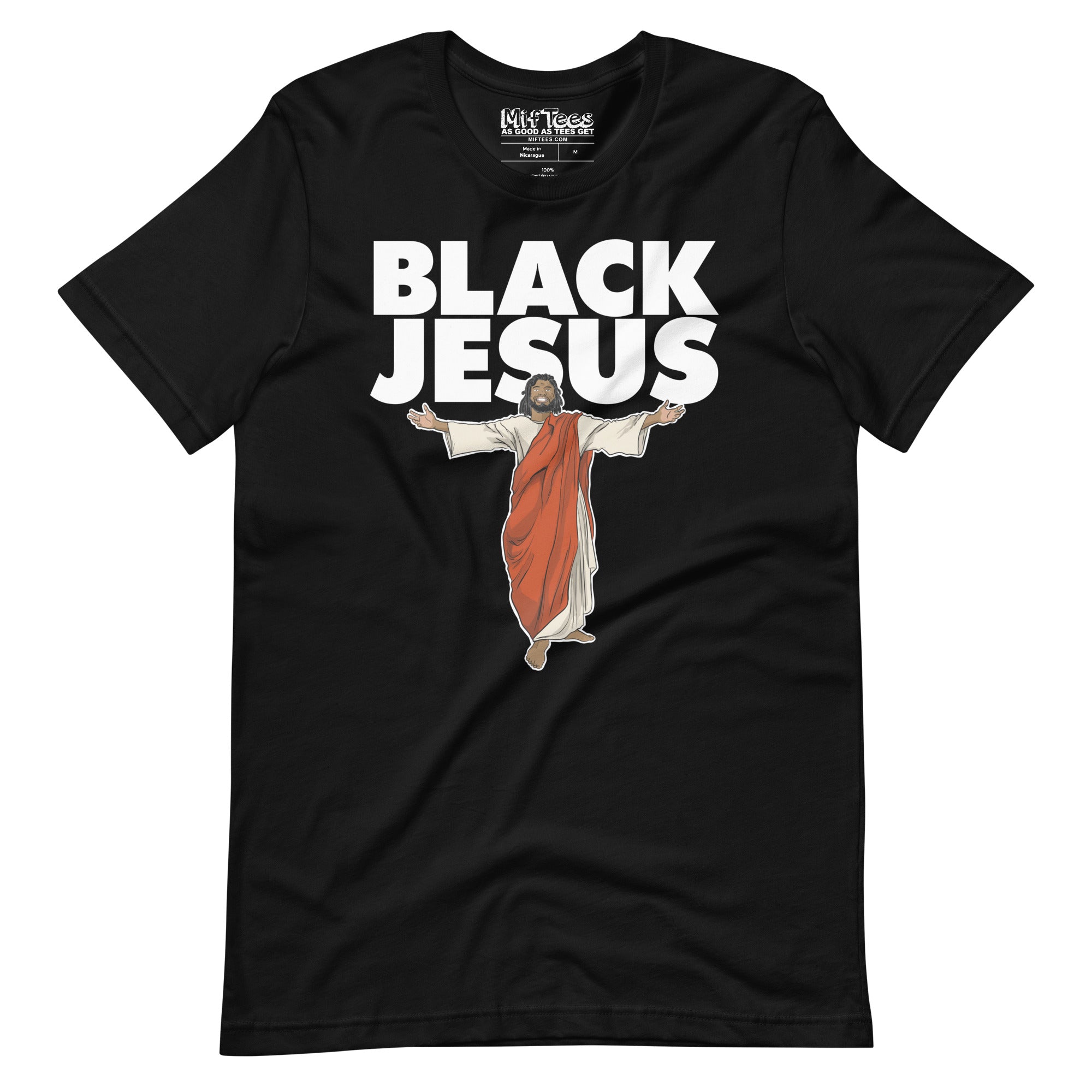 Our funny Black Jesus t-shirt features Black Jesus with arms open wide, ready to bless your day with a dose of holy humor along with the words Black Jesus. Whether you're feeling extra spiritual or just want to make everyone exclaim, "Can I get an amen?", this tee is your ticket to a laugh-filled miracle. Get ready to spread some divine laughter with our Novelty Black Jesus T-Shirt!