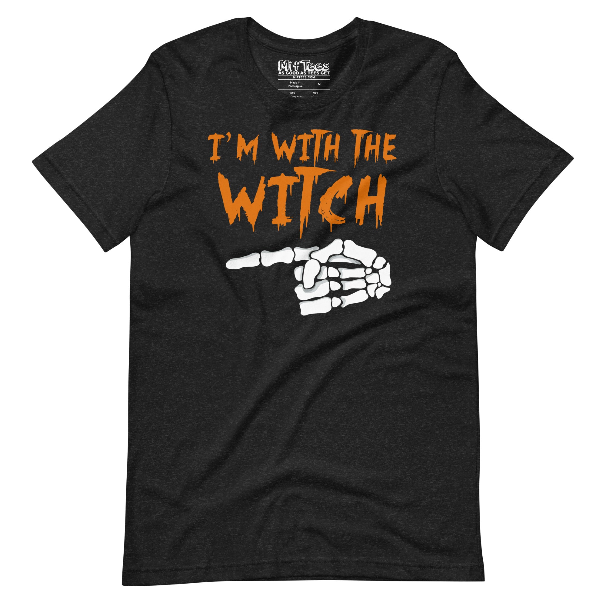 Let everyone know you’re rolling with the spell-caster in charge with this “I’m With the Witch” tee! Featuring a skeleton hand pointing left, it’s the ultimate way to flaunt your spooky crew. Match it with our “I’m With the Witch” tee (hand pointing right) for a hilarious duo, or pair it with the “I’m Not a Witch, I’m Your Wife” tee for even more laughs! Whether you’re creeping through a Halloween party, casting spells at a haunted house, or just hanging with your wickedly funny friends, this tee is a must-have for showing off your witchy connections.