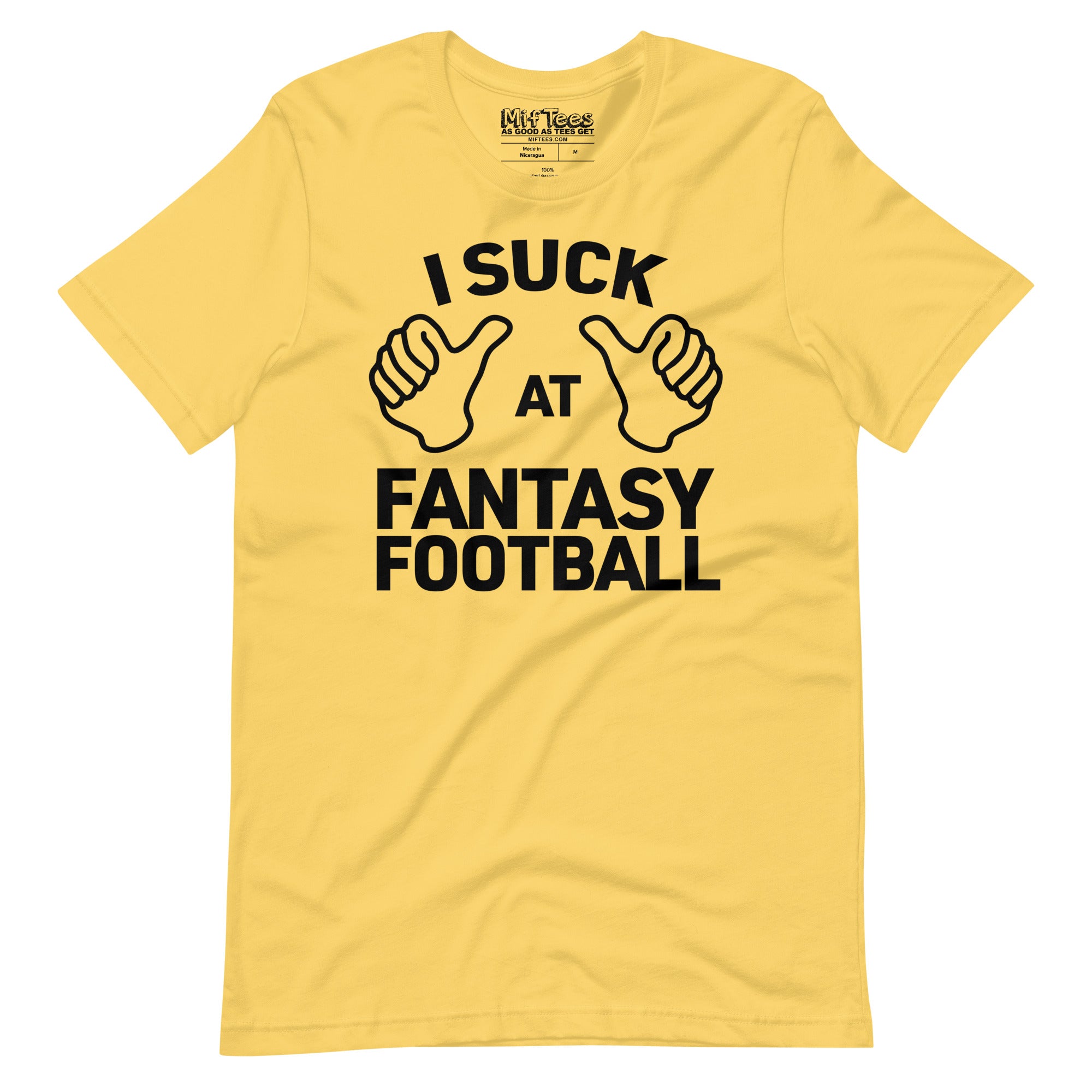 This funny fantasy football last place t-shirt lets you own your Fantasy Football skills (or lack thereof) with two thumbs pointing up and the bold statement: "I Suck at Fantasy Football." Perfect for anyone who knows they didn’t quite make the cut in the league! Ideal for that end-of-season roast or draft night, this tee is a hilarious way to join in on the laughs and let everyone know who’s holding up the league from the bottom.