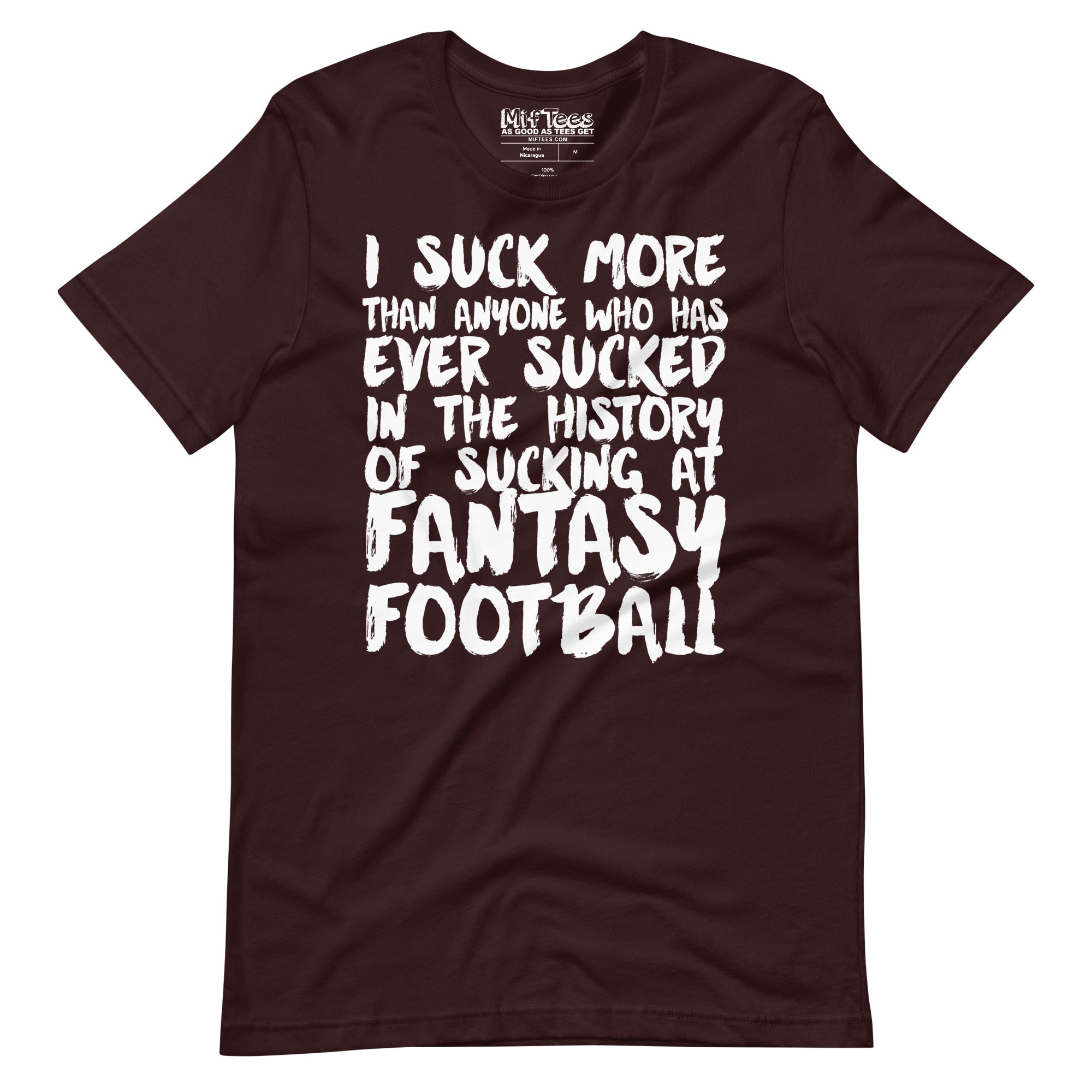 This fantasy football loser t-shirt boldly declares, “I Suck More Than Anyone in the History of Fantasy Football.” It’s the perfect way to embrace your last-place status and give everyone a good laugh at the end of the season. Ideal for those league gatherings, trophy ceremonies, or draft days, this tee lets you own your title as the ultimate underdog with pride. If you’re the king of terrible picks, wear it loud and proud – get your “I Suck at Fantasy Football” tee and let the trash talk roll!