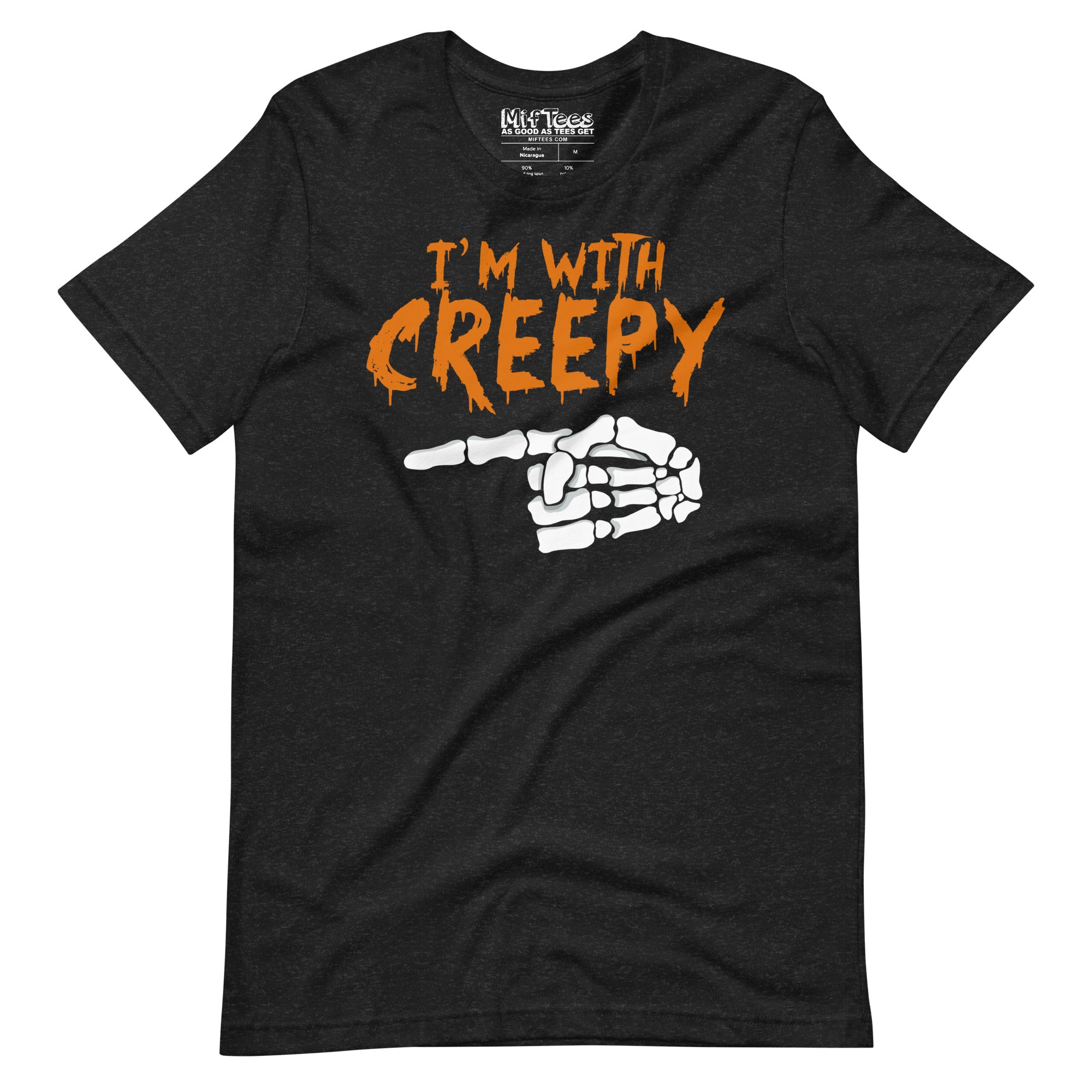 Let the world know you’re rolling with the creepy crowd this Halloween with this "I'm With Creepy" t-shirt! Featuring a skeleton hand pointing left and the words “I’m With Creepy,” this tee is perfect for pairing up with your spookiest friend. Got a creepy bestie or an entire crew of weirdos? Match this shirt with our other “I’m With Creepy” tee featuring a hand pointing right, so everyone knows who's causing the Halloween mischief. Whether you're going to a Halloween bash or trick-or-treating with your spooky squad, this tee is an easy and hilarious group costume.