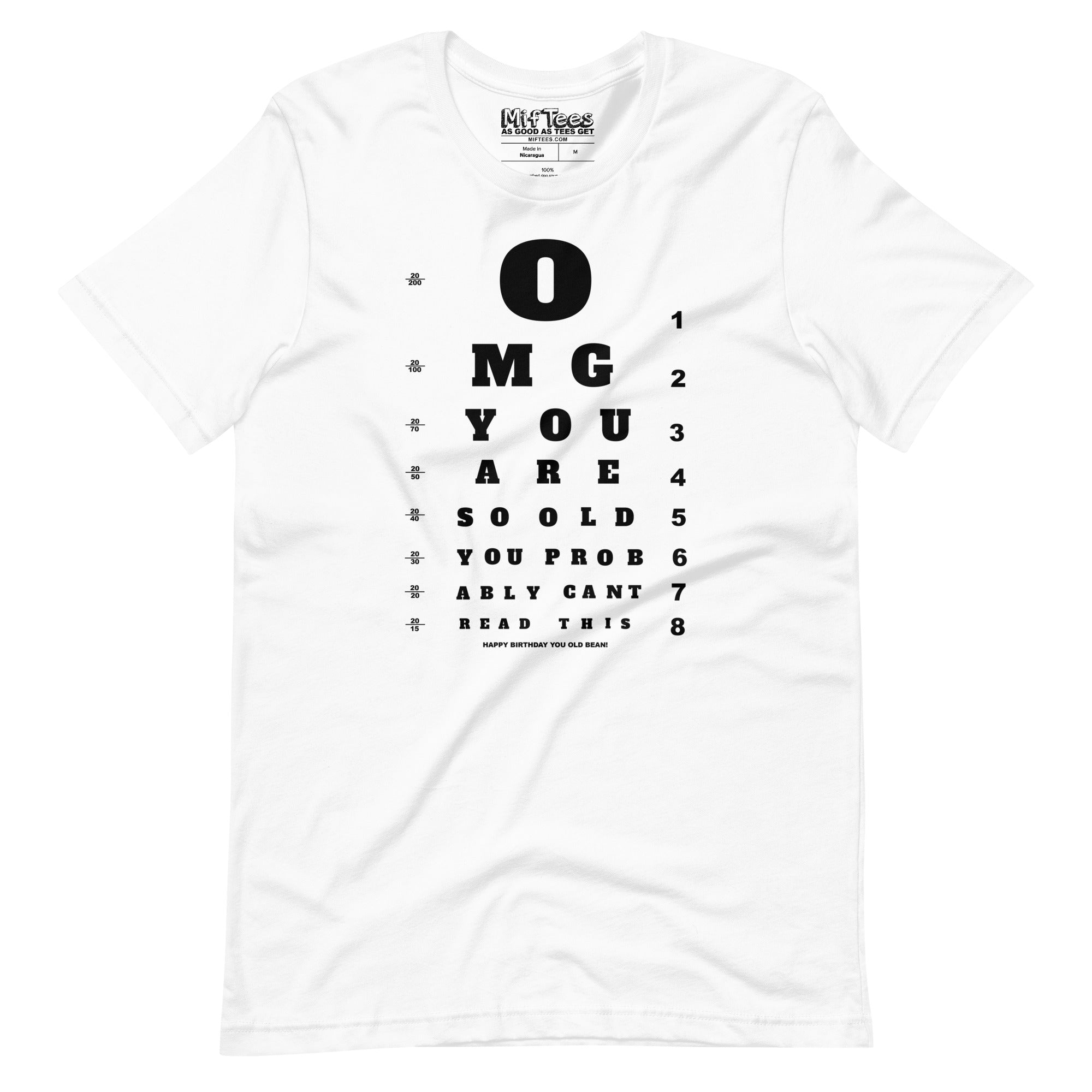 Get the laughs going at any birthday party with this OMG You’re So Old You Probably Can’t Read This t-shirt! Featuring a clever eye test design with letters shrinking in size until they’re totally unreadable, this tee is perfect for that friend who’s not getting any younger! The letters get smaller and smaller, just like a real eye test, until they vanish – just like their youthful eyesight! Great for anyone hitting the big 40, 50, 60 (or older!) with a sense of humor.