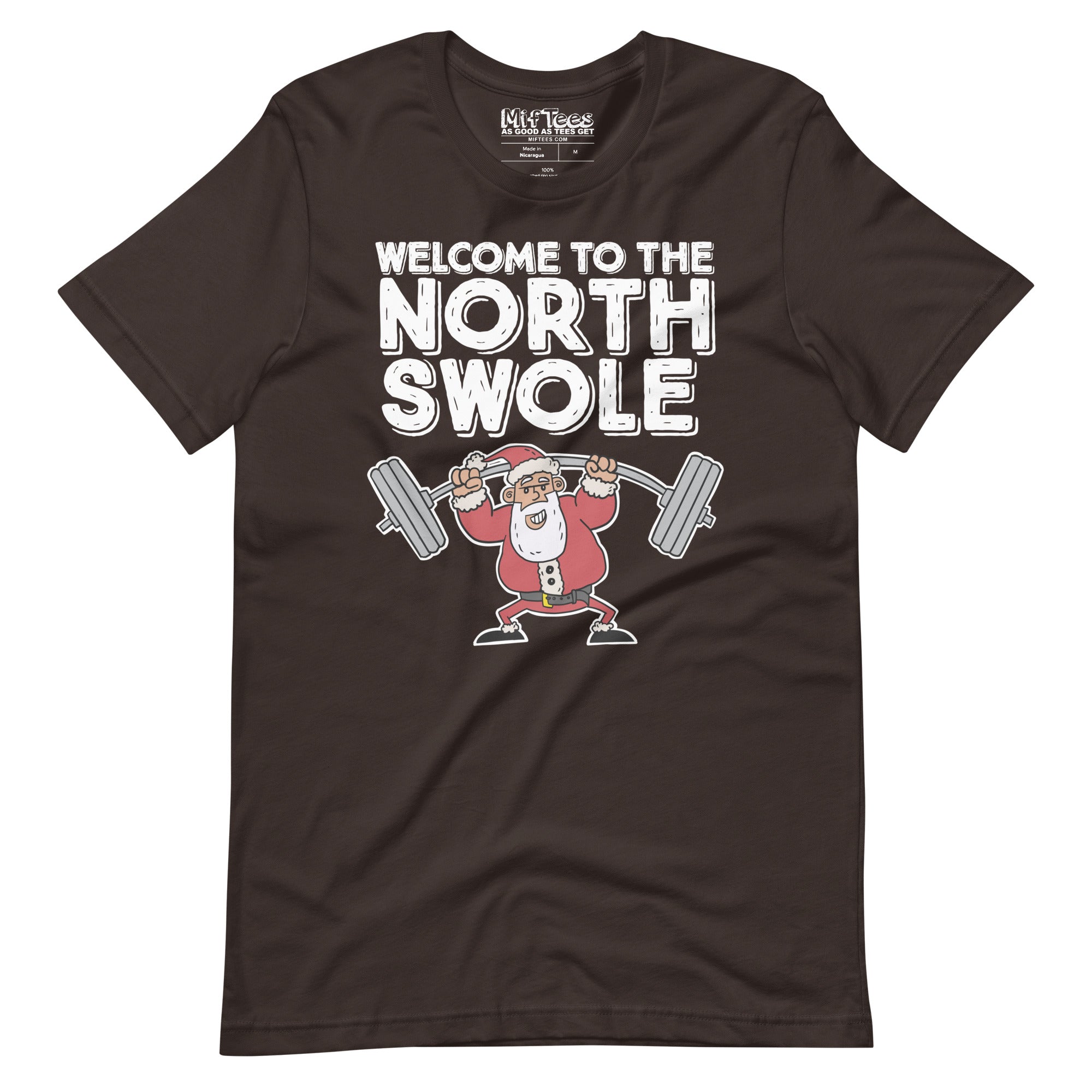 funny Welcome to the North Swole graphic tee with a Swole Santa lifting weights. This funny Christmas tee is perfect for anyone who loves Christmas and gym humor, showcasing a festive Santa who’s serious about his reps. Flex your festive spirit with the “Welcome to the North Swole” tee – because even Santa's lifting weights and spreading holiday cheer!